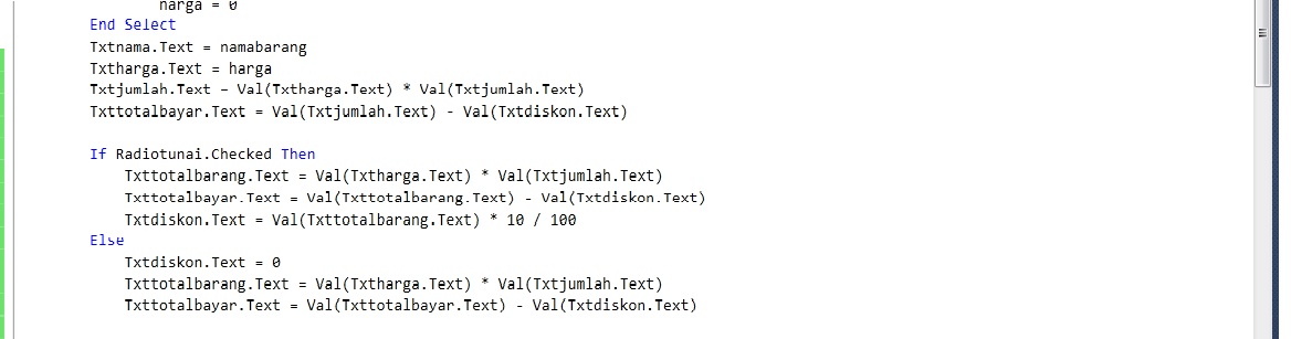 Txttotalbarang.Text = Val(Txtharga.Text) * Val(Txtjumlah.Text)
